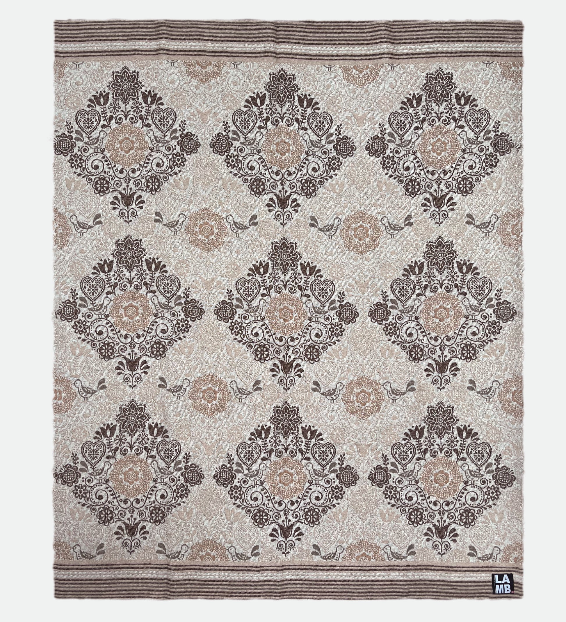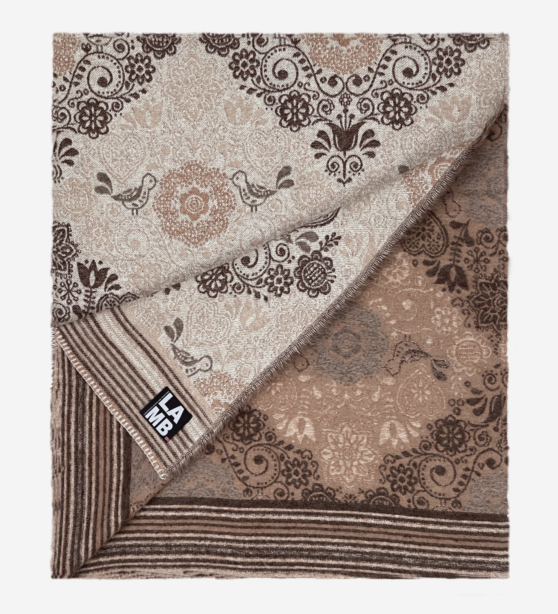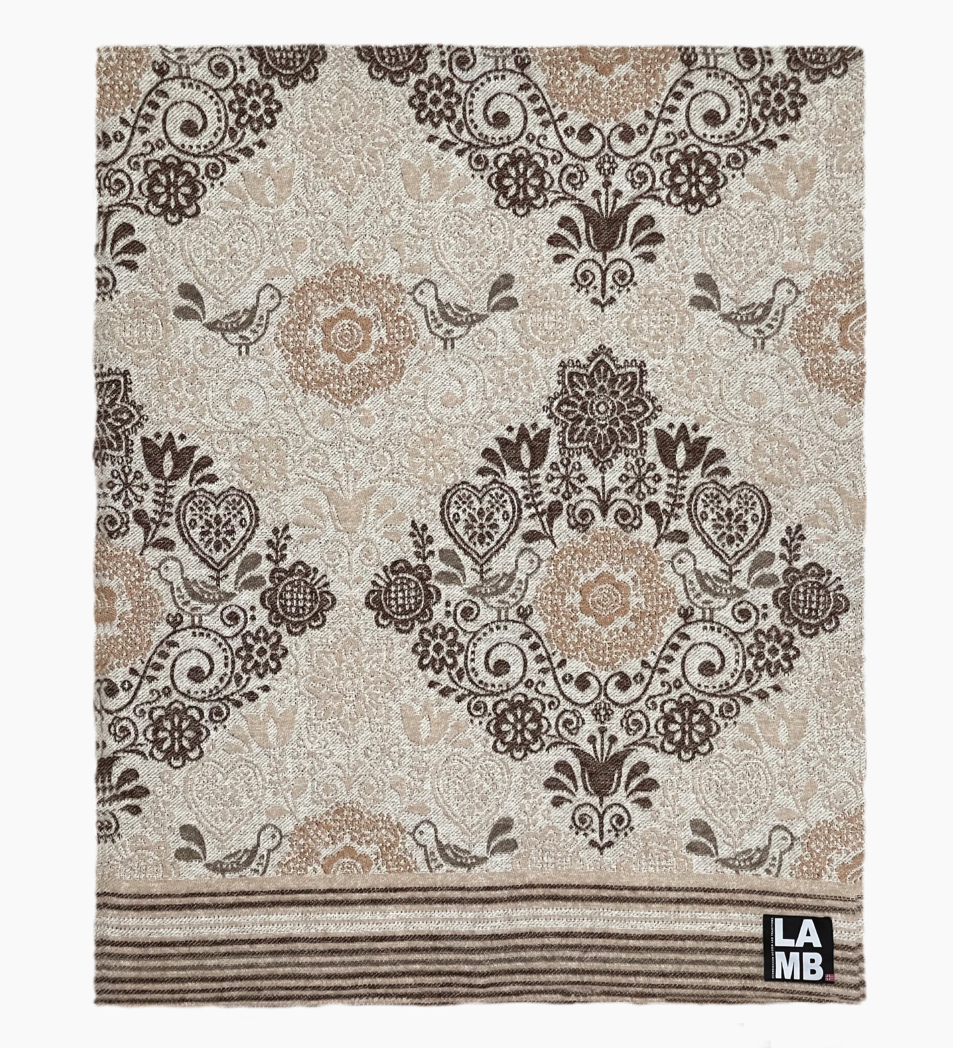 Et smykke av et pledd! Stor størrelse på hele 160 cm x 200 cm. Vakkert teppe i beige og brun farger med inspirasjon fra skandinaviske gamle mønstre og rosemaling. Pleddet kan fint brukes som både sengeteppe, koseteppe eller bare et blikkfang på en sofa. Dette er et pledd du blir glad i!