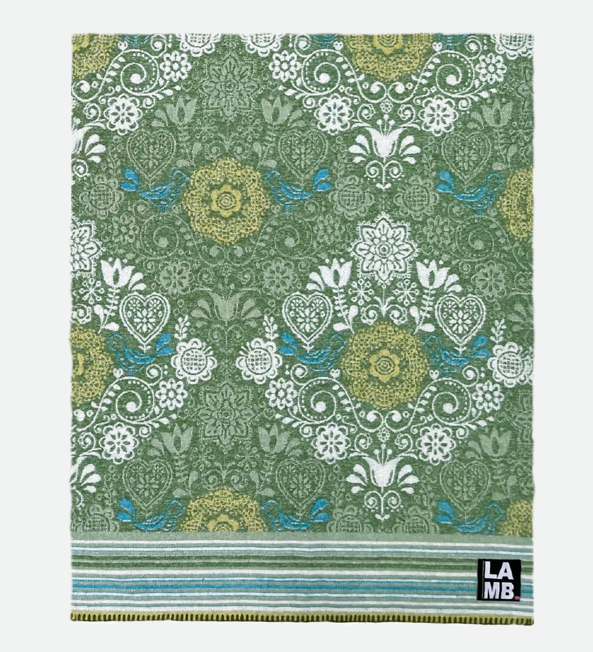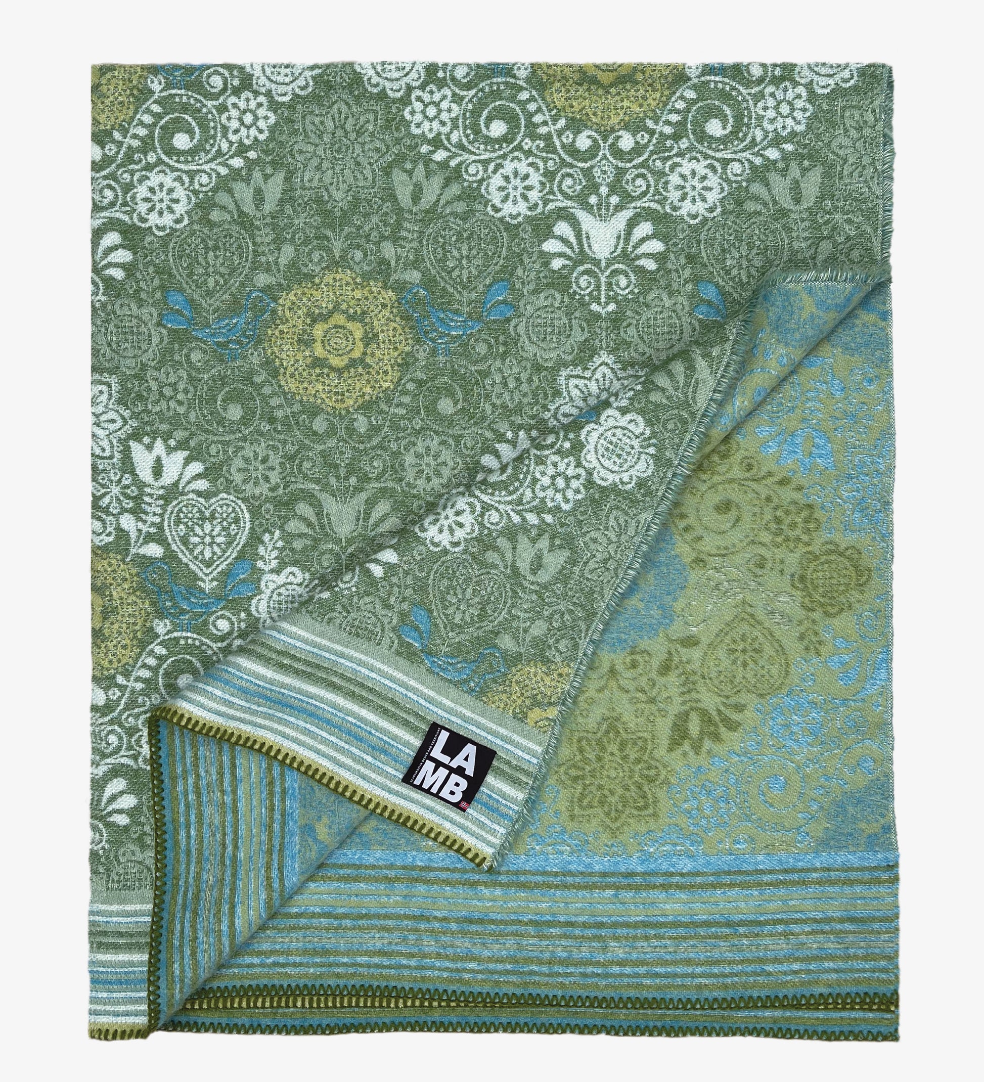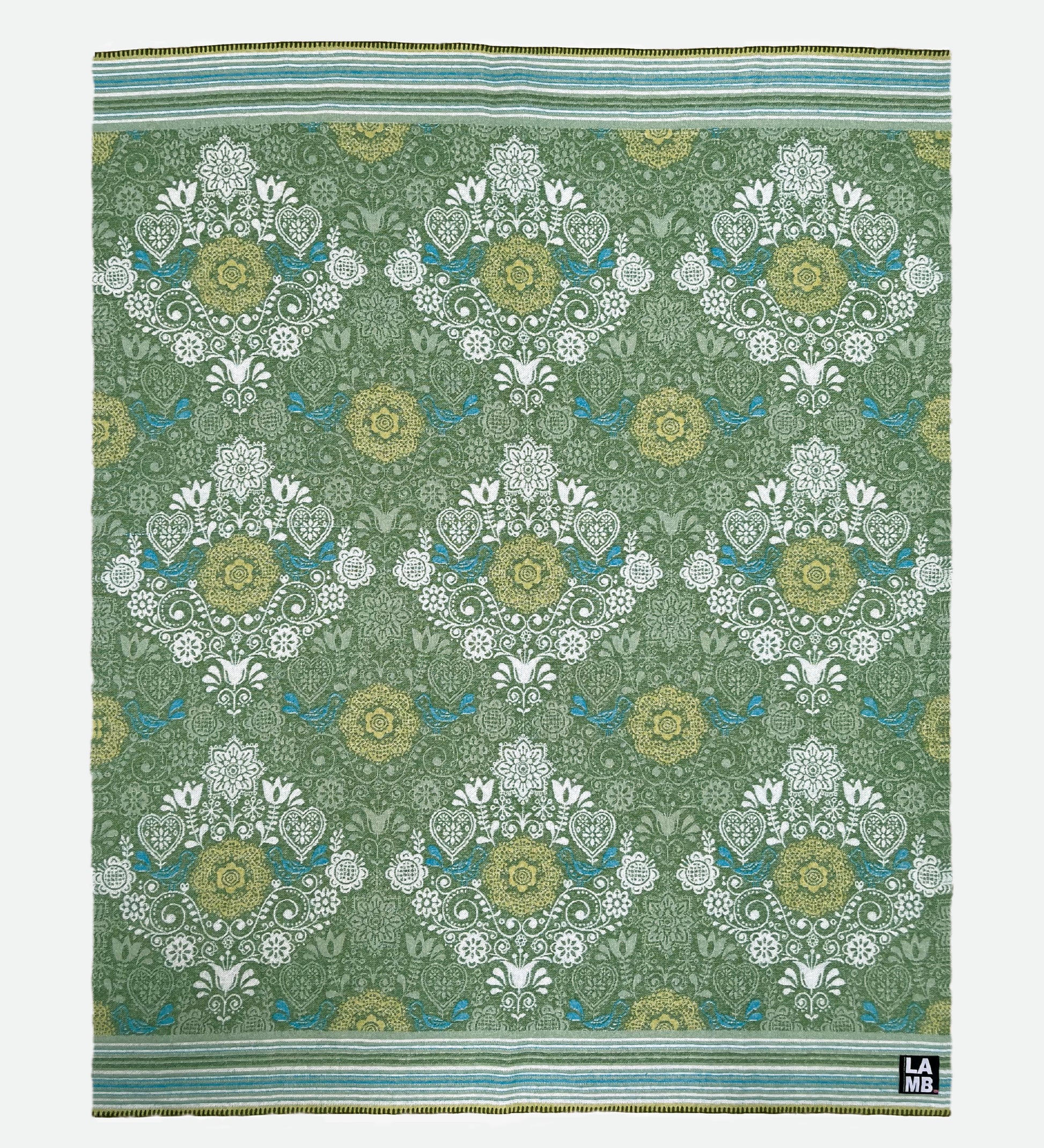 Et smykke av et pledd! Stor størrelse på hele 160 cm x 200 cm. Vakkert teppe i grønnfarger med inspirasjon fra skandinaviske gamle mønstre og rosemaling. Pleddet kan fint brukes som både sengeteppe, koseteppe eller bare et blikkfang på en sofa. Pleddet er vakkert både på forsiden og på baksiden. Dette er et pledd du blir glad i!